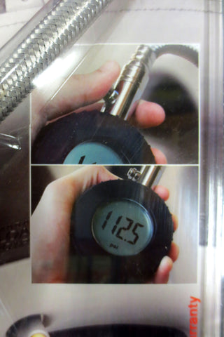 New professional RV & truck gauge by Accutire, model MS-5520. Large LCD screen with 0.5 resolution and 0-150 PSI range, bleed valve for exact pressure, extra long handle for dual tires, sure grip rubber handle and storage pouch. Surplus from a truck shop in Quebec, Canada.