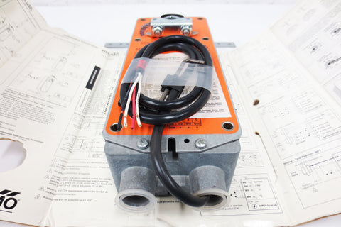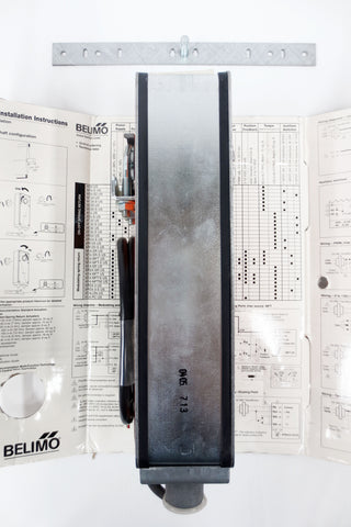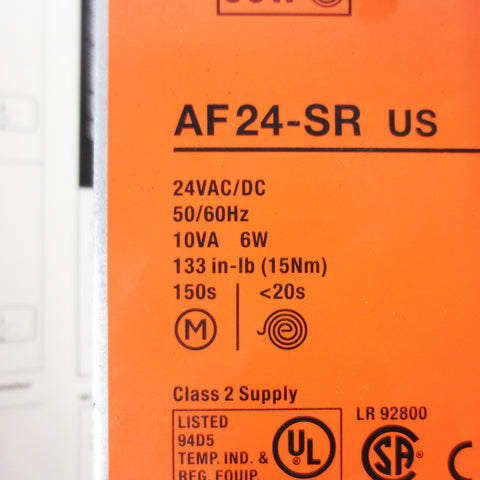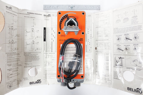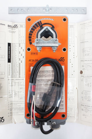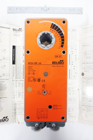 New, open box, with instructions and bracket. Tested and working. Spring Return Actuator by Belimo, model AF24-SR US. Specifications: 133 in-lb (15 Nm), Damper approx. 33 sq. ft, 24VAC/DC, Spring Return, Modulating and Fail-safe. Device measures 3 7/8 X 10 3/4 X 3 1/4 and weighs 2.8 kg.