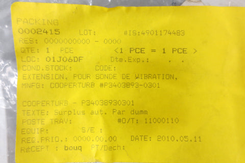 New, in its original bag with tags. Cooper Turbocompress 13" vibration sensor probe extension, model P3403893-0301. Bag opened for inspection, perfect condition.