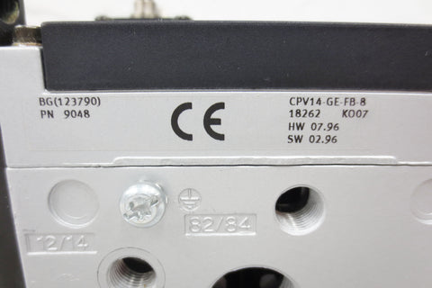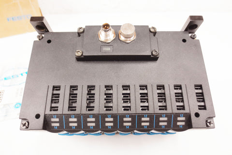 New, open box, perfect condition. 8-way valve terminal block by Festo, model CPV14-GE-FB-8. 4 unopened strips of tags and original box.