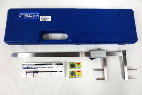 New professional 20" electronic brake drum gage. Model Ez-Drum 74-150-020 by Fowler. Complete with case, instructions, two CR2032 lithium batteries and original tags. Digital display, multifunction: Toggle between mm, in or fractions, 4" drum preset, retain measurement on display, zero setting, on/off. Rugged hard plastic case.