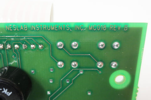 New, no box, perfect working condition. 4 digit LED display module by Neslab Instruments, model MC018 rev. B. It has 5 buttons (S1 to S5), 5 green indicator lights (D5 to D9) and a 6 pin cable. Surplus industrial electronic from a closed plant in Quebec, Canada.