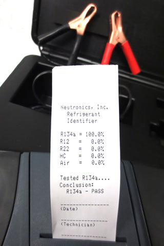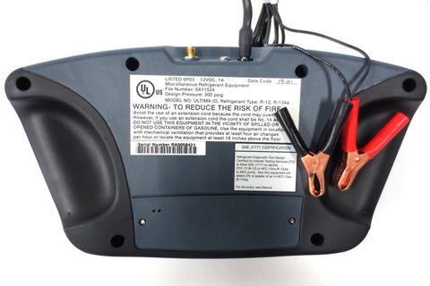 New, tested, includes all original accessories, instructions manual and case. Automotive refrigerant analyzer / identifier by Neutronics, model Ultima ID, part number 5-06-7000-65-0. Kit includes a 6-foot long red & black clips power cable (connects to a vehicle's 12VDC battery), both R12 and R134A sample hoses, the R134A tank adapter fitting, instructions manual, hard case and a paper roll for its internal printer. The optional rechargeable battery / charger kit is not included (part number 6-02-6001-04-0). Case has built in storage for charger kit if needed. Case size is 18.5 X 16 X 6 inches, total weight 9 pounds. New surplus from a closed plant in Montreal (Quebec, Canada).