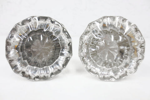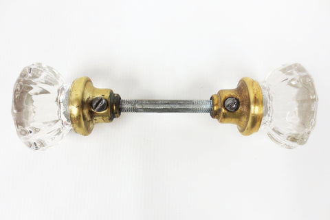 Complete pair with screws and rod, matching glass knobs and base shapes. Authentic antique Victorian door knobs. Ready to install, professionally cleaned, patina preserved. 12 points crystal glass, 2 inches diameter, no chips, no stains. Heavy brass and metal bases. Salvaged from a Victorian home in Montreal, Quebec, Canada. Several more sets in store for your home restorations. Lot #11.