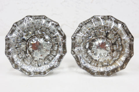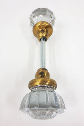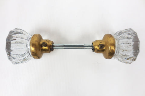 Complete pair with screws and rod, matching glass knobs and base shapes. Authentic antique Victorian door knobs. Ready to install, professionally cleaned, patina preserved. 12 points crystal glass, 2 inches diameter, no chips, no stains. Heavy gold toned metal bases. Salvaged from a Victorian home in Montreal, Quebec, Canada. Several more sets in store for your home restorations. Lot #7.