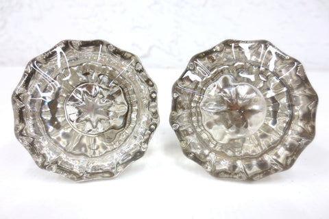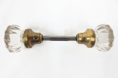Complete pair with screws and rod, matching glass knobs and base shapes. Authentic antique Victorian door knobs. Ready to install, professionally cleaned, patina preserved. 12 points crystal glass, 2 inches diameter, no chips, no stains. Heavy gold toned metal bases. Salvaged from a Victorian home in Montreal, Quebec, Canada. Several more sets in store for your home restorations. Lot #9.
