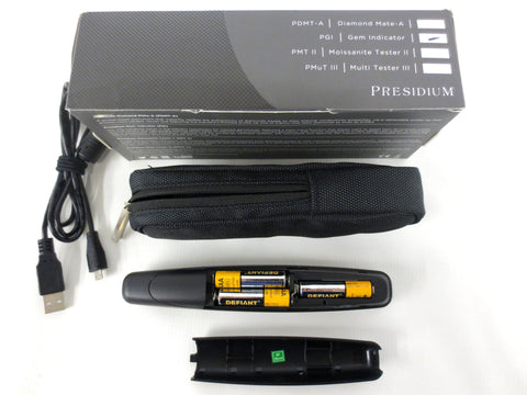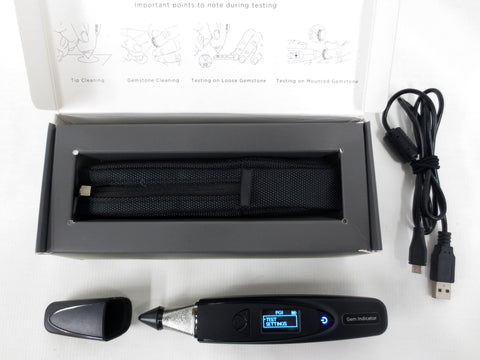 New with box, pouch and USB wire, no manual. High quality handheld digital tester for 31 types of gemstones. Digital LED screen shows results within 6 seconds. Detects stones based on thermal conductivity and has a 12 colors input function for more accurate results. Easy to change probe tip as needed. This is an enhanced version of the Presidium Gem Tester/Colored Stone Estimator. Three AAA batteries included.