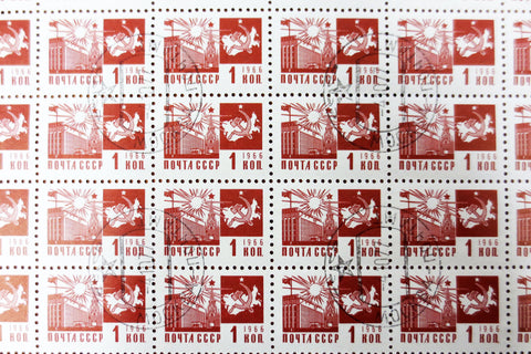 Complete Sheet of 100 stamps from Russia marked Noyta CCCP 1 KON 1966 with the Palace of Congresses in Kremlin. Sheet is complete, never used, mint condition, no discoloration. Cancellation stamps are clean and centered. Stamps were issued 1966-12-29 and expired 1992-01-01. Noyta means postage. From a collector's estate. Sheet will be shipped in a non bendable and waterproof package.