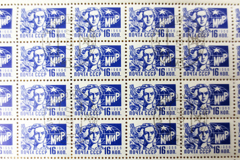 Complete Sheet of 100 stamps from Russia marked Noyta CCCP 16 KON 1966 with a woman and dove. Sheet is complete, never used, mint condition, no discoloration. Cancellation stamps are clean and centered. Stamps were issued 1966-11-24 and expired 1992-01-01. Noyta means postage. From a collector's estate. Sheet will be shipped in a non bendable and waterproof package.