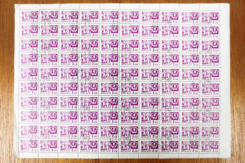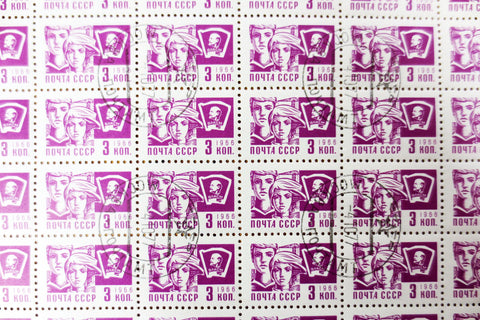 Complete Sheet of 100 stamps from Russia marked Noyta CCCP 3 KON 1966 with the Komsomol. Sheet is complete, never used, mint condition, no discoloration. Cancellation stamps are clean and centered. Stamps were issued 1966-10-25 and expired 1992-01-01. Noyta means postage. From a collector's estate. Sheet will be shipped in a non bendable and waterproof package.