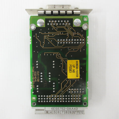Tested, functional, original tags, very clean. This is a Siemens Simatic S5 interface module model 6ES5752-0AA43. It has a 48Pin (3 rows) male DIN connector and a 15Pin (2 rows) female port. Industrial surplus from a closing plant in Quebec, Canada.