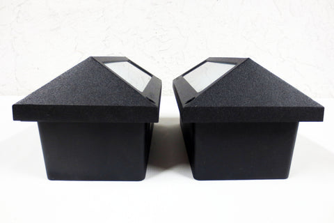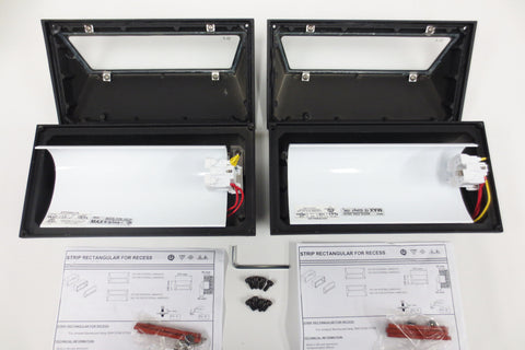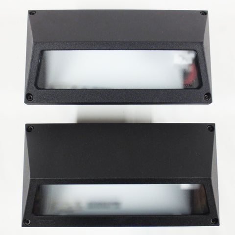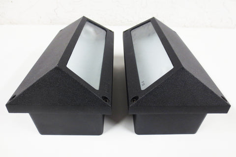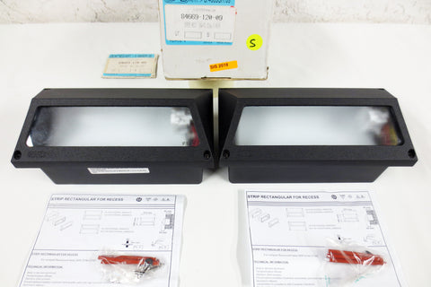 New, perfect condition, never installed. Both have instructions, tags and sealed hardware, only 1 box. Pair of recessed rectangular exterior ground wall lights for buildings and modern homes. High quality lights signed Simes Sistemalux Italy. Black, all die-cast aluminum, each light measures 10 3/4 X 5 3/4 inches, total depth 5 1/2 inches. Model Strip Rectangular IP55, 120 Volts, S.4669SR.09. Light bulbs not included, each light requires one fluorescent 13 Watts G24q-1 (around $7, local hardware store). Total weight 2 Kg.