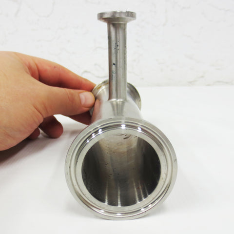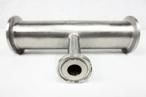 Very clean, ready to install. T vacuum fitting flange valve, 5 3/4" long. Both ends have a 2" outside and 1 3/8" inches inside diameter, center T end has a 1" outside and 3/8" inches inside diameter. Thick stainless steel. Marked ASME BPE SFF1. Weighs 286 gr.