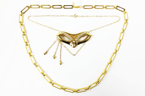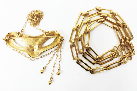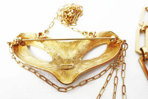 Perfect condition, ready to wear. Vintage costume jewelry from the 1960's signed Monet. 2 3/4" wide gold tone ball mask brooch with pendant chains. Comes with a separate 24" chain also signed Monet.