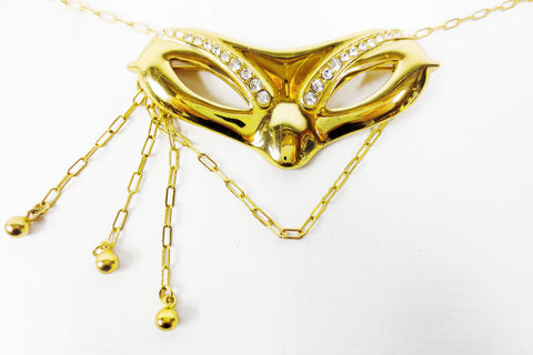 Vintage 1960's Monet Gold Tone Ball Mask Brooch 2 3/4" with 24" Chain, Rhinestones
