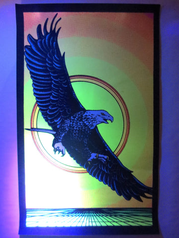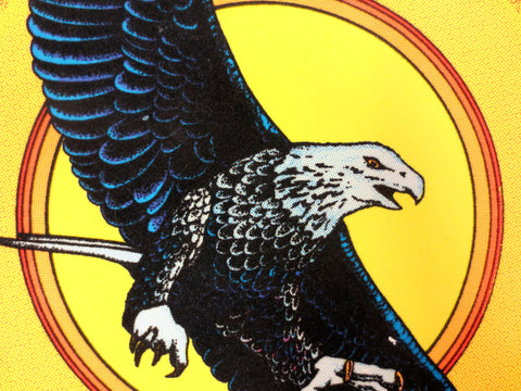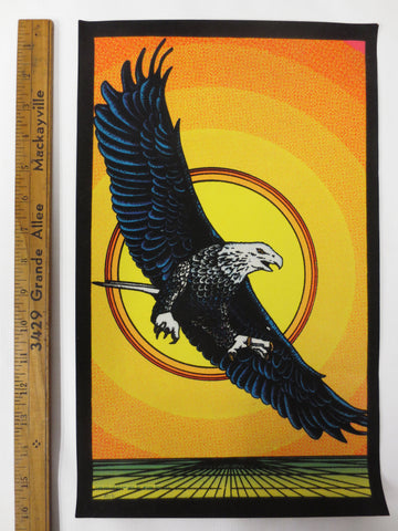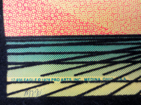 Excellent condition, no tears, vivid colors that glow under black light. Signed "17-935 Eagle, 1976 Pro Arts Inc., Medina Ohio U.S.A.". Very cool psychedelic poster of a bald eagle flying under the sun. Unique flocked and velvet finish. No frame, will be shipped flat in a sturdy and waterproof package. Dimensions: 16 X 9 7/8 inches. Great addition to your 1970's artwork collection or man cave.