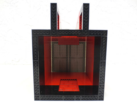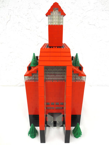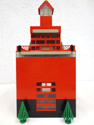Tall 17 X 7.5 X 7.5 inches Lego building with 1980's parts, over 550 pieces, estate find. Weighs 4.4 pounds (2 kg). Excellent condition, complete, no broken parts. It has a rotating tower, 39 red windows, over 130 see through bricks and front doors. Cool industrial lighthouse or church design, terrasse with pines on rooftop. Self standing and hollow inside. No manual, custom building for a large Legoland city display.