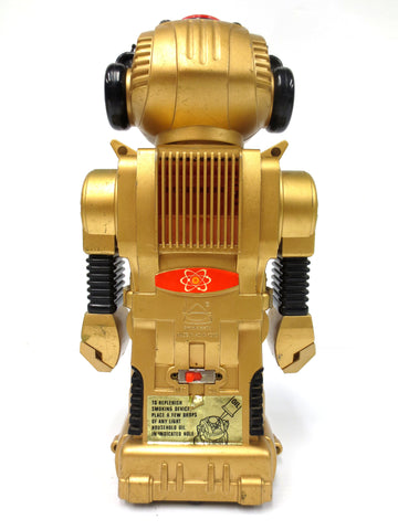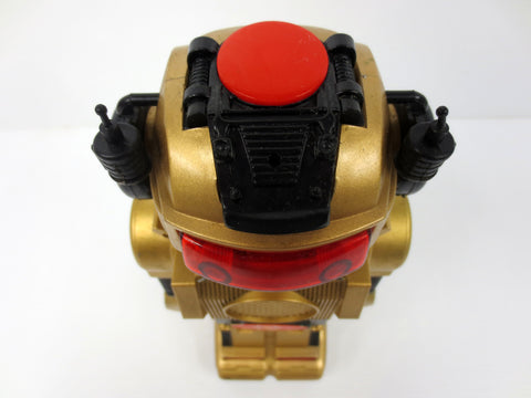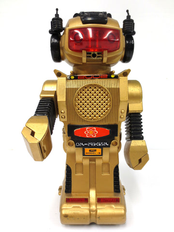 Works well, very clean, no broken or missing parts. 10.5 inches tall, speaks English, rolls and makes smoke when adding oil. On/Off switch, red lights. Marked Made in Hong Kong in 1984 by New Bright and was called Magic Mike. All stickers are still there. It shows light wear but no broken parts.