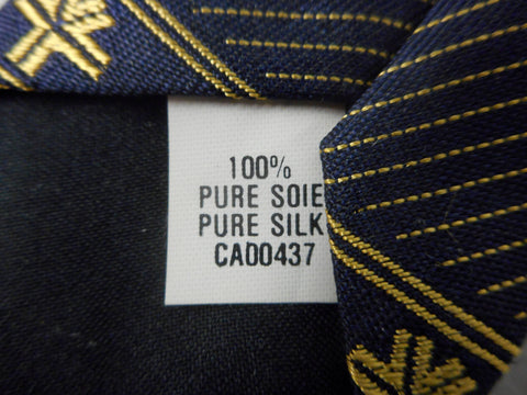 Official Montreal Police service necktie from the 1970's. Shows the SPVM logo (Service de Police de la Ville de Montréal). Dark blue and gold, signed by the designer "Calèche". 100% silk. 55 inches long, 1 1/4 to 3 1/2 inches wide.