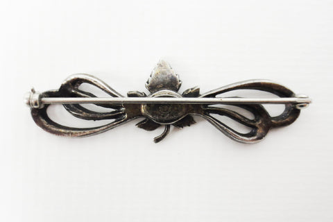 Vintage sterling silver .925 brooch signed Danecraft. Two superposed bows and a maple leaf in the center set with several small rhinestones. Original patina preserved, very clean, sturdy holding pin. Measures 2 1/4 X 3/4 inches, weighs 9 grams. From a collector's estate.