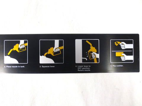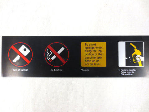 New, sticky side never used and ready to install. Genuine metal decal for gas stations, made by 3M. Measures 25 1/4 X 4 inches. Marked "Turn off ignition, No smoking, Avoid Spillage Warning, Remove Nozzle, Place Nozzle in Tank" and more. Perfect for a garage or man cave. Will be shipped in a sturdy box to avoid folding.