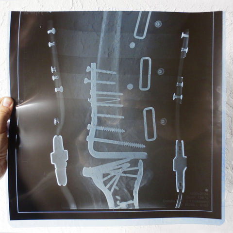 Excellent condition, no tears, flat and thick blue plastic sheet. Actual X-ray of a patient's broken knee and fracture, with medical screws, surgical plates and stabilizing straps. Can easily be framed with a light on back to see details clearly. Great addition to your medical collection or as a prop. Will be shipped flat in a rigid and waterproof package. Measures 14 X 14 3/8 inches.