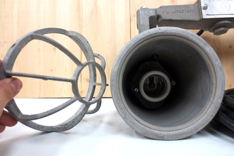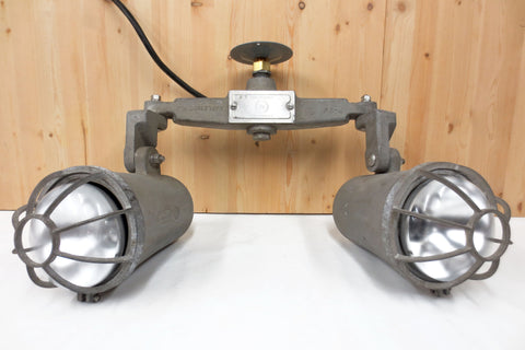 Excellent condition, fully functional, ready to install to your ceiling. Double spotlight signed Carlstadt Circle D Lights, New Jersey. Each light swivels vertically and horizontally and has a removable anti explosion dome. Lights have porcelain sockets that support ED type light bulbs up to 500 Watts (not included). Equipped with a long 16+ feet grounded wire which can easily be removed for direct electric wiring. We added a new ceiling mount adapter for easy installation. This light fixture is versatile and can also be mounted upside down. Light is cast aluminum, its arm is 15 inches wide, each spotlight has a 6 inches diameter and is 10 inches deep. Great for a loft, a large living room or a man cave garage.