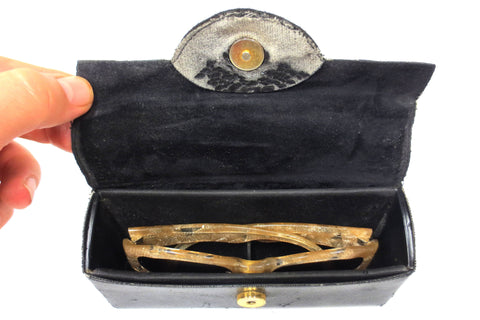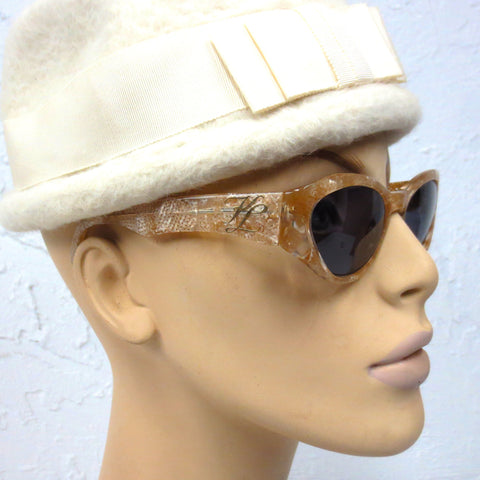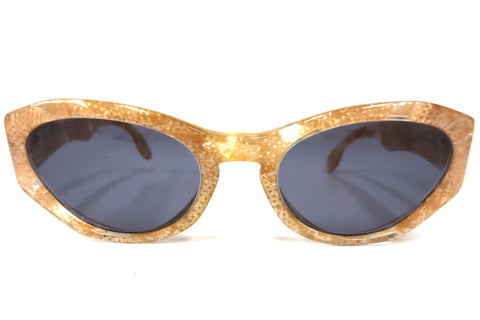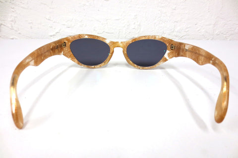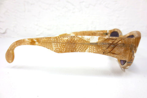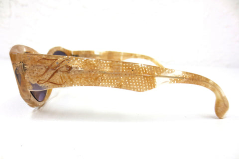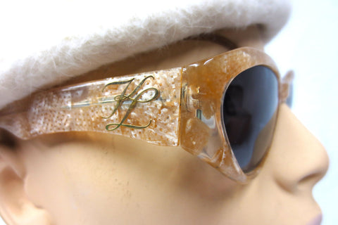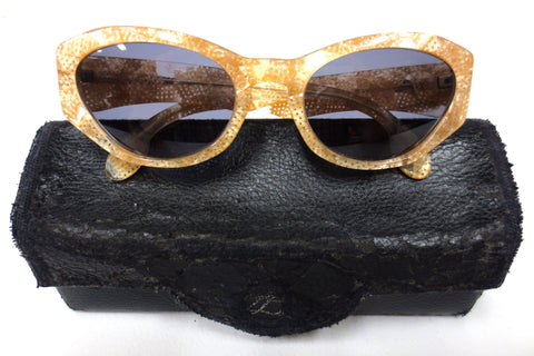 Vintage sunglasses signed Louis Vuitton with their original case. Sunglasses and lenses are a mint condition, beautiful gold mesh motif encased in translucent plastic, gold LV script monogram on each side. Lenses have a light prescription and can be replaced at your local optometrist. Lens shade is light purple. Case has the matching logo, is still sturdy but shows loss of leather finish. Sunglasses are 133mm wide X 41mm tall, temple length 125mm, bridge is 11mm wide at its narrowest, each lens is 49mm wide X 35mm tall. From the estate of a private collector in Montreal (Quebec, Canada).