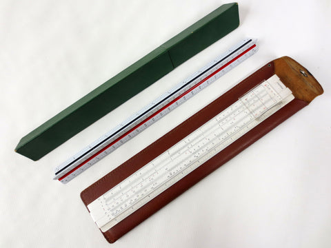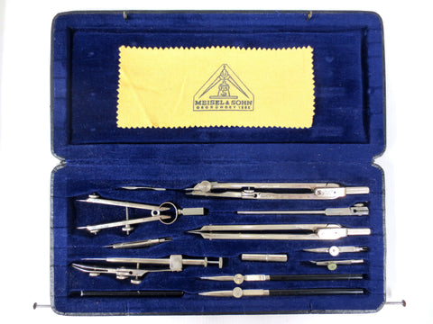 All 3 instruments are complete, very clean, original boxes. The drafting set is signed Meisel & Sohn K9 Gergründet 1882, sturdy case with blue velvet inside, no missing accessories. The 3 sided rule is signed A.W. Faber, Castell, 883/Z1, made in Germany. The 10 inches long Castell slide rule No. 261 is in excellent condition, in its original and clean leather sleeve, names marked by hand inside.