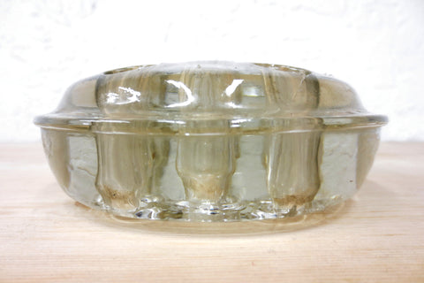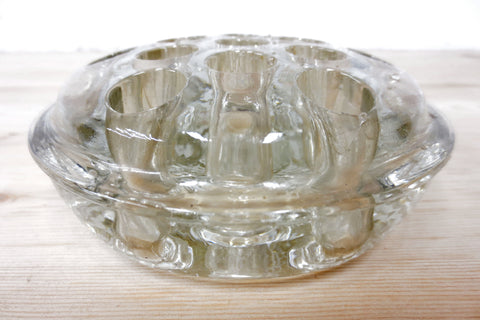 Excellent condition, vintage flower frog, solid colorless glass, no chips. 13 holes, 4 1/2 inches diameter, 1 5/8 in thick. Handmade, stands on 3 glass legs. Originally made to hold flowers, frogs are very practical to hold pens, scissors and paint brushes on a desk. Lot #01.