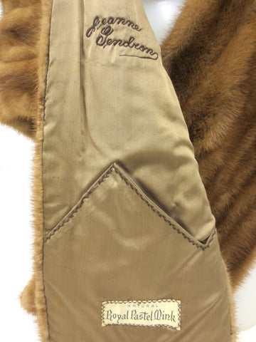 Professionally cleaned, excellent condition inside out.  All original, high quality, very chic. Signed "Jeanne Gendron, Creation Laflamme Fourrure Style, Natural Royal Pastel Mink". Made in Montreal, Quebec, Canada in the late 1950's. Custom made interior with two large hidden pockets. Measures 67 inches long, center is 14 inches and ends are 8 inches.