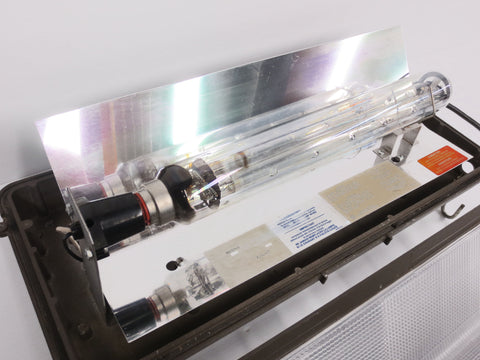 Ready to plug in, working tube light bulb included. Light box measures 20 X 8 X 9" and is in excellent condition. Light cover is heavy plastic, base is aluminum. Large internal reflector. Includes a Philips SOX 55 Watts low pressure sodium light bulb and a Philips Advance HX-HPF autotransformer ballast with its ignitor and capacitor. Suitable for hazardous locations. For your garage, man cave or industrial decor. Two metal hooks provided, 2 others can be added as needed. Or you can screw the light box directly to your wall in a minute.