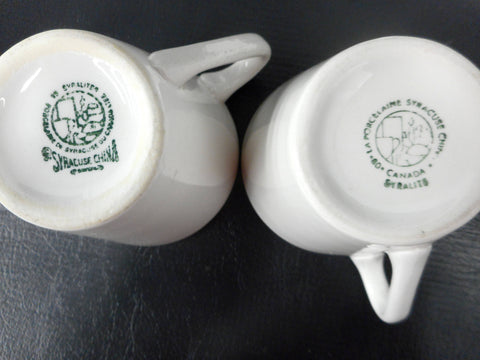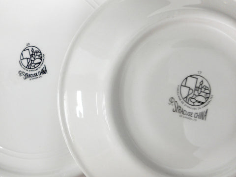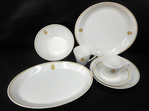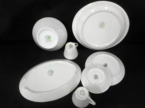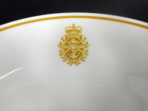 7 pieces in excellent condition, all signed Syracuse China Canada, 6 of them have the Royal Canadian Navy emblem. Includes: 2 matching coffee cups 3 3/8 inches diameter X 3 in tall, 1 soup bowl 7 5/8 in diameter X 3 in tall, 1 serving plate with handle shapes 11 3/4 X 10 1/2 in, 1 oval serving plate 11 3/4 X 8 5/8 in, 1 desert plate 8 in diameter and 1 small plate 5 3/4 in. Used by Canadian Navy personal during special ceremonies and officer's mess.