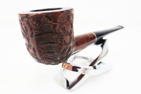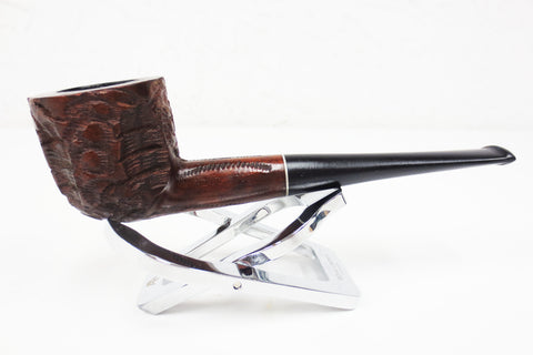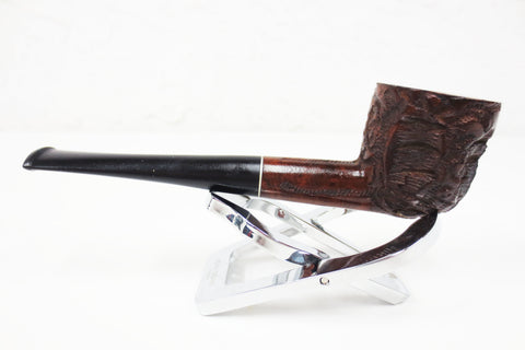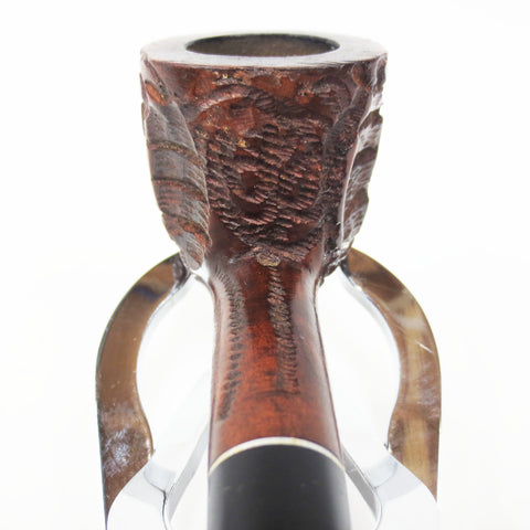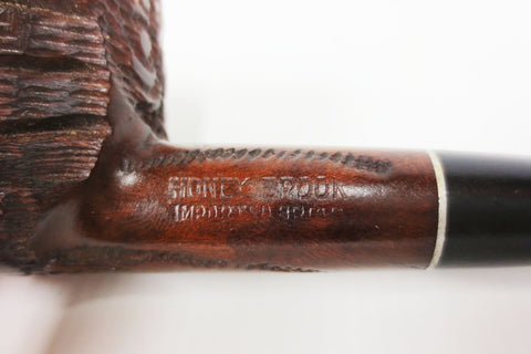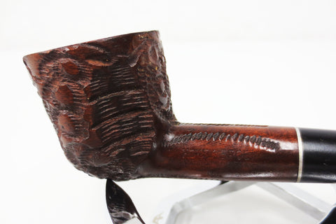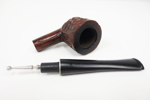Excellent condition, vintage rustic tobacco pipe from a collector's estate. Ready to use, professionally cleaned. Original stem, perfect fit and holds well, no teeth marks. Fancy and very clean aluminum filter. Bowl is signed Honey Brook Imported Briar, dark brown wood. Beautifully hand carved bowl, rustic style. Pipe measures 5 1/4" long, bowl is 1 1/2" tall and 1 3/8" wide. Stand not included.