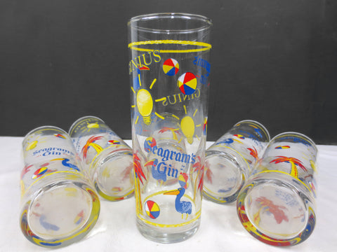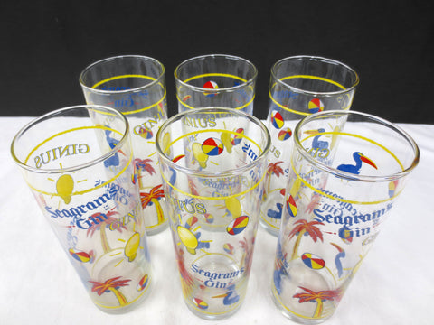 Graphics all intact, excellent condition, very clean. Vintage advertising by Seagram's Gin. Each one measures 6 3/8 inches tall and has a 2 1/2 inches diameter. Marked "Ginius, Seagram's Gin", with light bulbs, toucans, a beach, palm trees and beach balls.