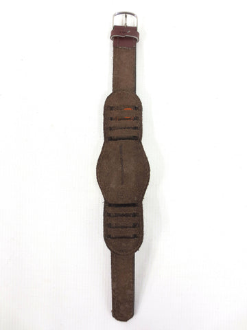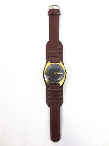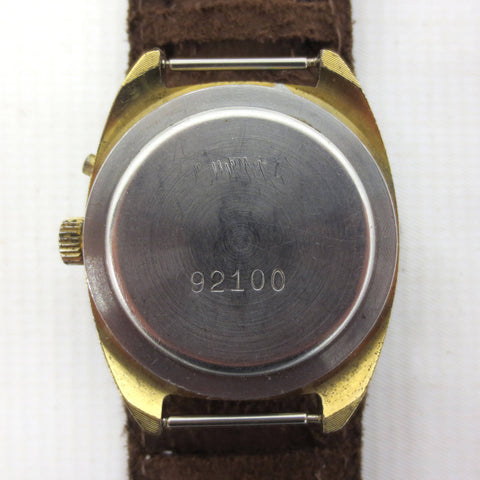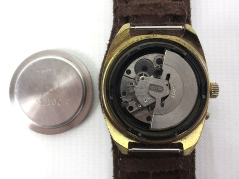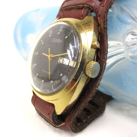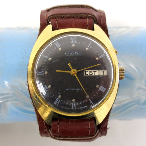 Excellent condition, fully functional, ready to wear. This is a vintage 1970's automatic Slava watch from Russia with day and date and a push button to change it. Gold tone 1 3/4 X 1 1/2 inches case with a black dial and roman numerals. It has a brown pilot leather band from Russia, size 18, 10 inches long. Crystal is in excellent condition, no cracks, no stains. Case shows light signs of wear due to age.