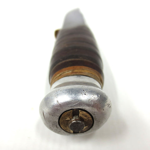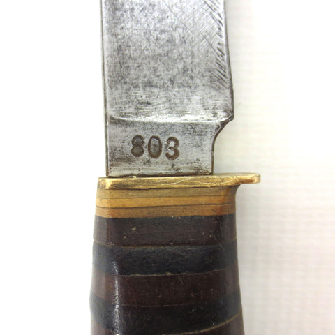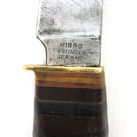 Sharp, all original, signed Mibro Solingen Germany 803. Vintage knife from a Canadian collector's estate. 7 1/2" long knife, 4 1/4" blade, sturdy stacked leather handle, brass guard and aluminum pommel.