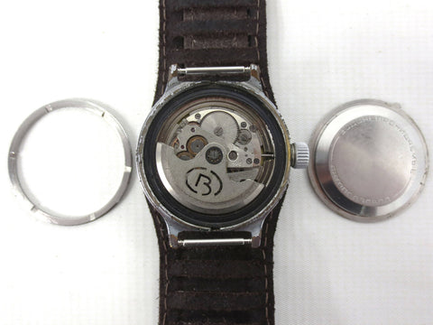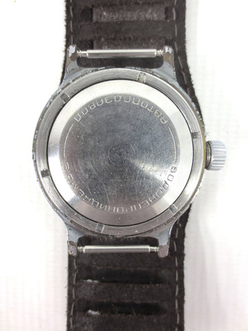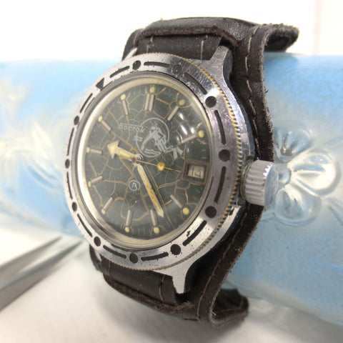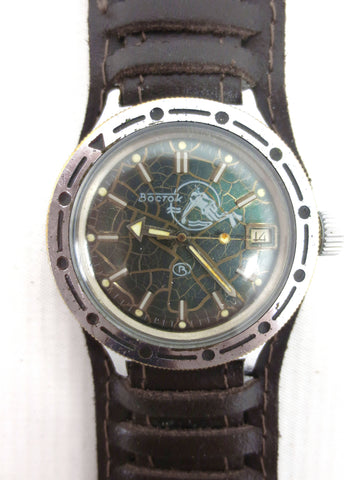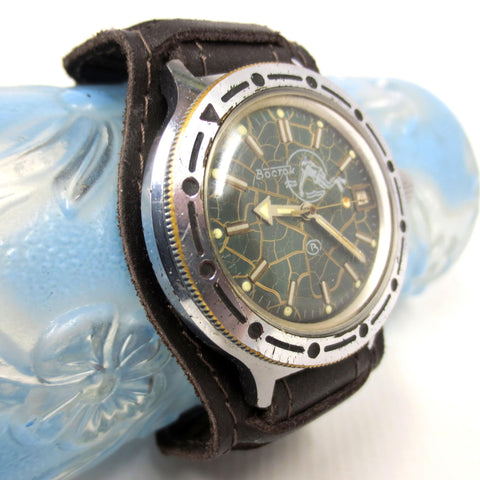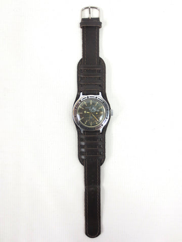Excellent condition, fully functional, ready to wear. This is a vintage 1970's automatic Vostok diving watch from Russia with a rotating dial, a screw on crown and a thick stainless steel case. It has a dark brown pilot leather band from Russia, size 18, 10 inches long. This beautiful watch has a rare dark green and gold fish net dial with a scuba diver image. Case has a 1 1/2 inches (38 mm) diameter case. Crystal is in great condition, no cracks, no stains. Case shows only light wear due to age.
