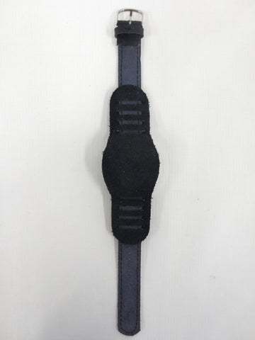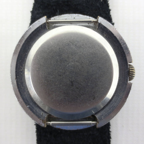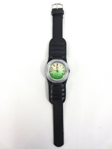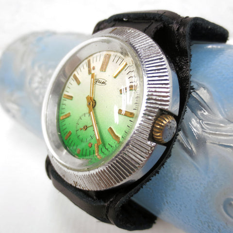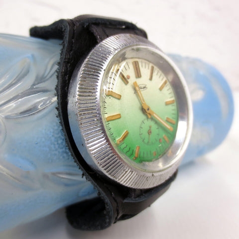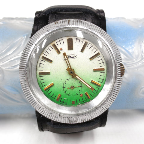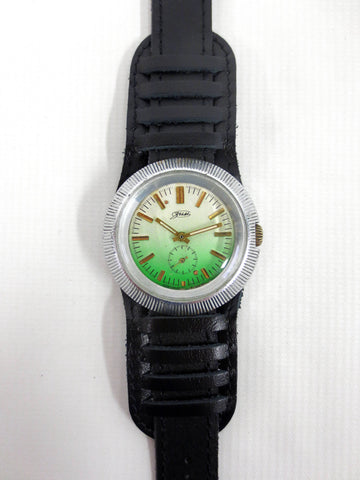Remarkable condition, fully functional, ready to wear. This is a vintage 1970's ZIM Pobeda hand wind and silver tone watch from Russia. Large 43 mm diameter round case with a green and white gradient dial and gold arms. It has a black pilot leather band from Russia, size 18, 10 1/4 inches long. Crystal and case are in excellent condition, no cracks, no stains. Heavy and comfortable watch, cool flying saucer design.