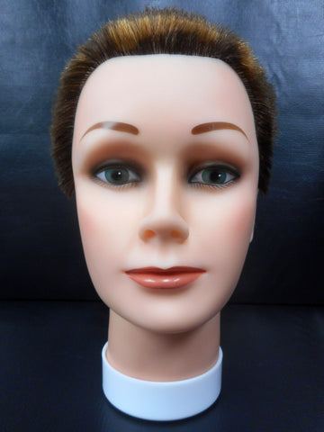 Excellent condition, no scratches, no stains. Signed Dannyco, original tag at the bottom. Shaved marbled brown hair cut, green eyes, white skin, pink lips. Hair is synthetic and realistic. 10 inches tall, 6 inches wide, 7 inches deep. Great to display sunglasses, hats or use as a Halloween prop. Was used as model in a hair salon. Other vintage mannequin heads available in store, different eyes and hair colors.
