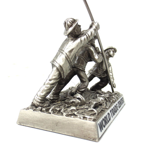 Original, complete, marked World Trade Center New York. Commemorates the rescue and salvaging work of 9/11 Ground Zero workers. Heavy pewter souvenir, 3 X 2 X 5 inches. Removable flag pole for transport.