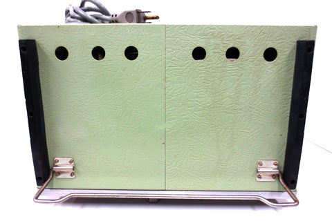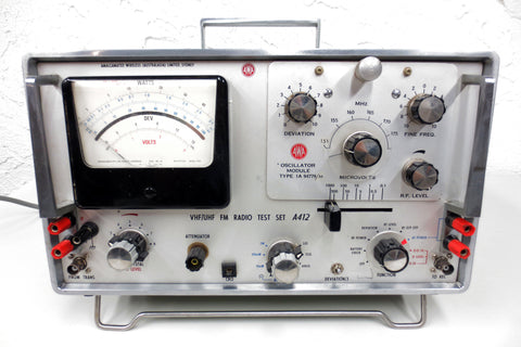 Fully functional, complete and clean VHF/UHF FM Radio Test Set model A 412, 30 to 520MH range, with an oscillator type 1A 94779/M. Imported by Marconi and built by AWA Amalgamated Wireless (Australasia) Limited, Sydney, Australia. Portable, sturdy metal body, apple green, retractable front stand. Long and clean retractable power cord, plugs into standard type B outlets. This test instrument is designed for measuring receiver sensitivity, noise quieting, discriminator linearity and audio power output, transmitter deviation and RF power output. Measures 13.5 X 9.5 X 8.25 inches and weighs 20 pounds.