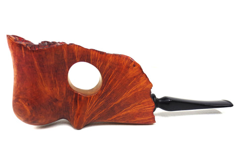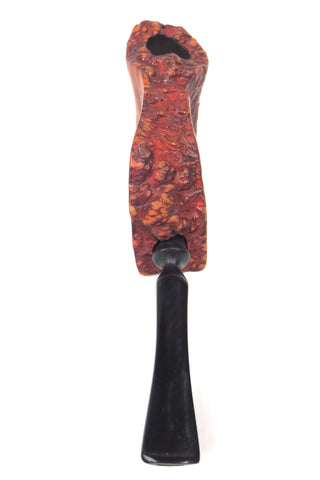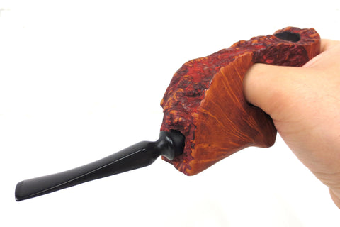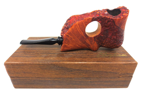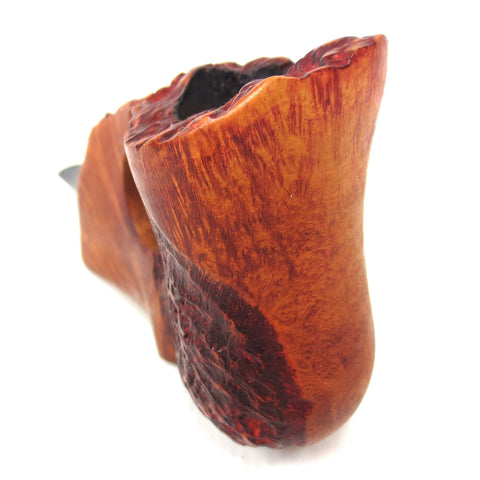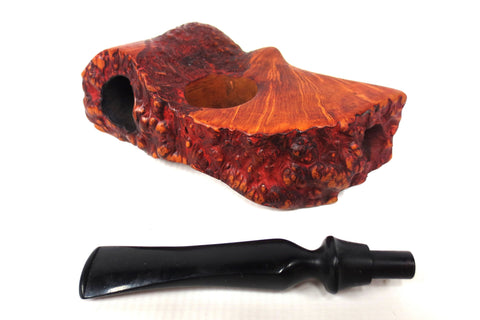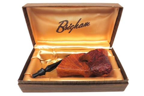 Vintage, never used, new old stock (NOS). Massive Brigham tobacco pipe hand carved in red wood, unique thumb space. Measures 7.5" long, bowl has a 1 5/8" diameter and is 2 5/8" tall. Original faux wood box marked Brigham inside and out. Pipe fits tightly inside. Original stem, fancy design, holds very well. Left side shows faded model marking "King". From the estate of a private collector in Montreal (Quebec, Canada).