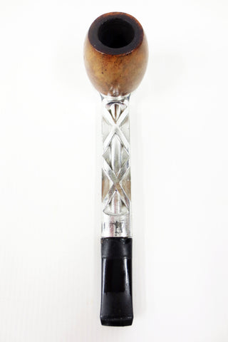 Excellent condition, modernist estate tobacco pipe made in England. Silver nylon body, exchangeable 1 1/8" tall wood bowl, 1 1/4" outside diameter. Pipe measures 5 3/4" long. Disassembles in 3 parts. Professionally cleaned, ready to use. From a collector's estate.