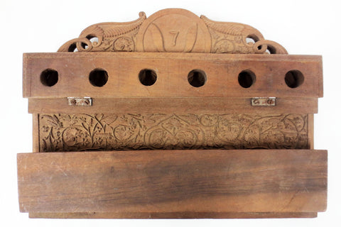 Solid wood wall rack in perfect condition, very clean, no broken or loose parts. Both shelves fold for easy storage. Fits 6 tobacco pipes (not included). Beautiful engravings of 2 crossed swords with number 7, branches, flowers and leaves. Measures 13 x 9 1/2 inches.