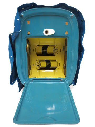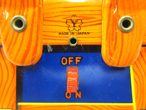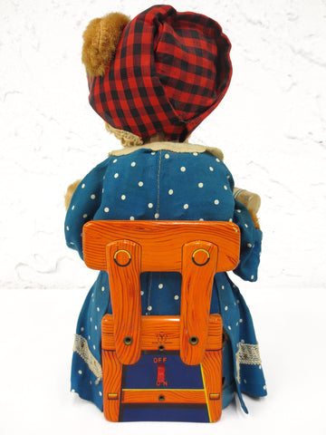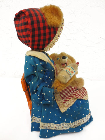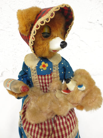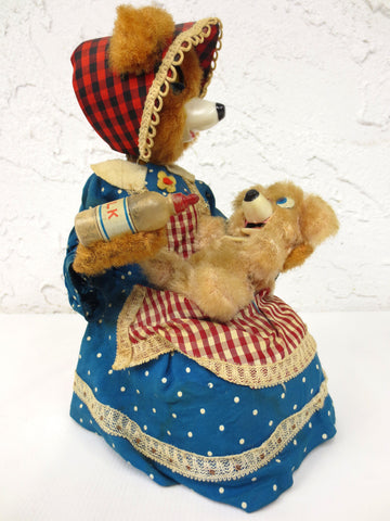 Excellent condition, clean, complete. Mechanism no longer functional. "Hungry Bear" made in the 1950's, signed "Y" Japan for the Yonezawa Gangu Toy Company. Clean battery compartment, as if never used. Mama bear's dress is very detailed and in great condition. Feeding a milk bottle to baby bear while sitting on an orange tin chair. Measures 9 inches tall. Great display piece for your tin toy collection.