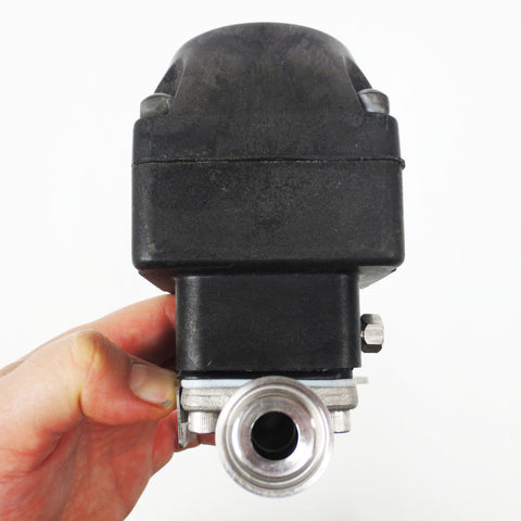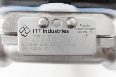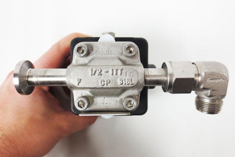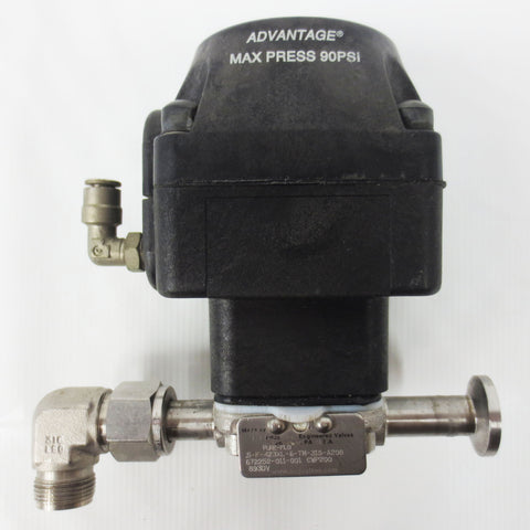 Very clean, inspected and functional. Spring-to-close valve by Advantage ITT Pure-Flo, 60 Psi max pressure, model 5-F-423XL-6-TM-31S-A208. Left flange has a 1" outside and 3/8" inches inside diameter. Right side has a #316 Swagelok 90° elbow fitting and compression nut. 1 quick connect 3/8" 90° elbow fitting is also included. Weighs 1.07 Kg and measures 5 X 5  X 3 inches.