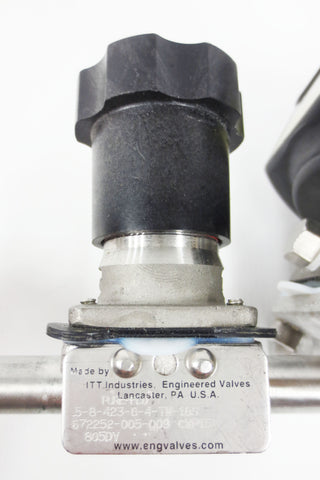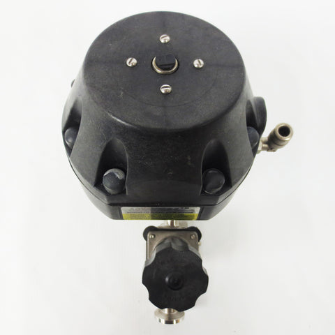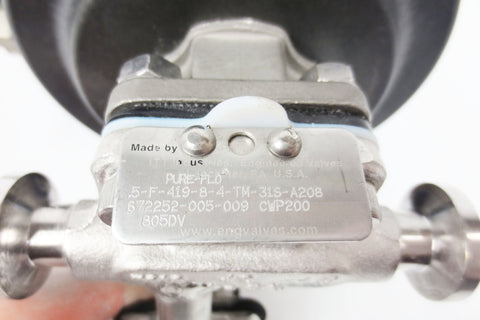 Very clean, inspected and functional. Spring-to-close valve by Advantage ITT Pure-Flo, 60 Psi max pressure, model 5-F-419-8-4-TM-31S-A208 with an added diaphragm valve #2155 by ITT Pure-Flo. All 3 flanges have a 1" outside and 3/8" inches inside diameter and come with their gaskets (3). 2 flange clamps and a quick connect 3/8" 90° elbow fitting are also included. Weighs 2.08 Kg and measures 4 1/4 X 8 X 6 inches. All parts can easily be disassembled as needed.