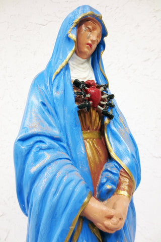 Acquired from a closed monastery in Montreal, Quebec, Canada. 23.5 inches tall plaster sculpture of Our Lady of Sorrows, Virgin Mary crying with her heart pieced with seven swords. Perfect condition, original paint with gold flakes, no chips, no cracks. Weighs 4.72 kg and measures 7 X 23.5 X 5.5 inches.