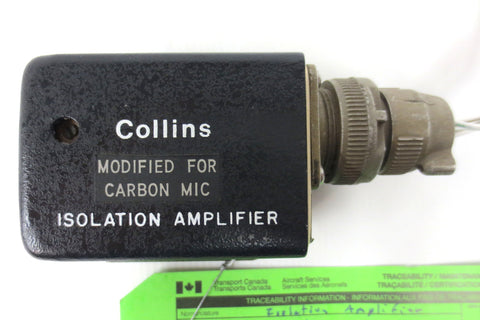 Inspected by Transport Canada Aircraft Services, "ready to fly" green inspection tag. Excellent condition, complete with connectors and wires. Insolation amplifier signed Collins Avionics "Modified for Carbon Mic". Part number P/N 522-2866-000, type number 356C-4, FAA TSO C50a, serial 17171. Only 2 available.